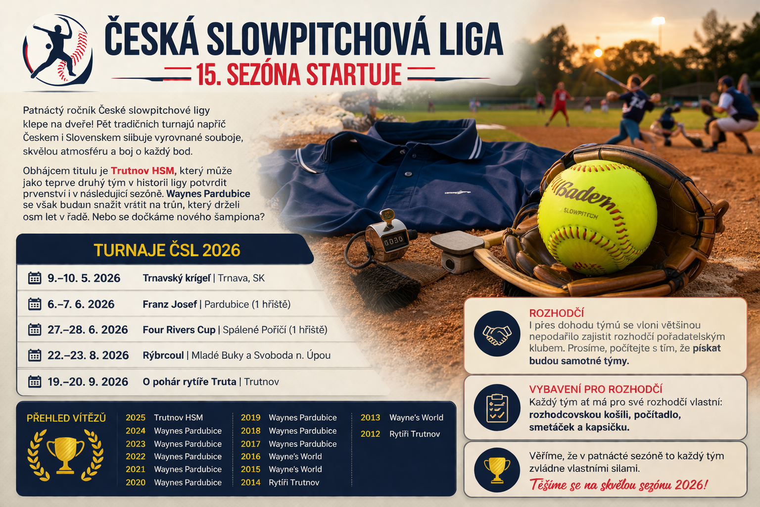 Jedno je jisté – ČSL 2026 bude opět o kvalitním slowpitchi, rivalitě i skvělé atmosféře na hřištích.
